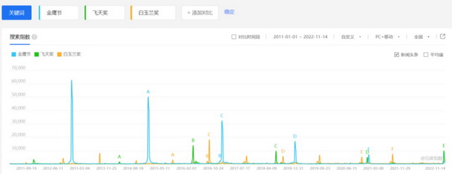 虽然金鹰奖年年都有争议,但仍是三大奖中最具有大众认知度的。百度指数最早可追溯至2011年1月1日,从这一天到毒眸(ID:DomoreDumou)发稿前,金鹰节对比飞天奖、白玉兰奖,搜索量都是最高的。