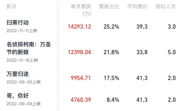 据灯塔专业版数据,今年11月累计票房为5.68亿,其中《扫黑行动》1.43亿,《名侦探柯南:万圣节的新娘》1.24亿,两部影片合力贡献了本月接近一半的票房。第三四名分别为《万里归途》与《哥你好》,均非本月新片。
