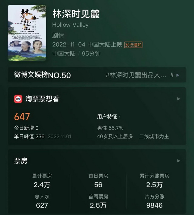 月初,在经历了10月漫长的无片上映期之后,定档了几部几乎没人看的新片。其中,《林深时见麓》因单日票房只有56元还一度在社交平台引发了一波关注。