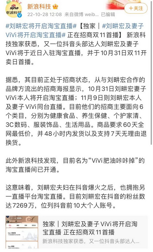 早前就有媒体报道,称刘畊宏即将进行淘宝直播带货,并开启了对外招商,主要产品方向为健康食品、养生保健、个护家清、3C数码、服装饰品、生活用品六大类别,并要求商品保证“60天内全网最低价”、“48小时发货”、“7天无理由退货”等。