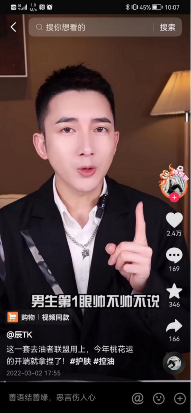 “男生第一眼帅不帅不说,那油腻啊是真要命”,男性美妆博主辰TK在抖音上一边给男性用户推荐相应的美妆产品,一边讲解如何迎来桃花运的去油步骤。目前,辰TK的粉丝有172.4万,他的短视频涵盖了男士裸妆教程、战痘指南、发型教程等内容,几乎为入门男颜经济的男性消费者们提供了一站式服务。