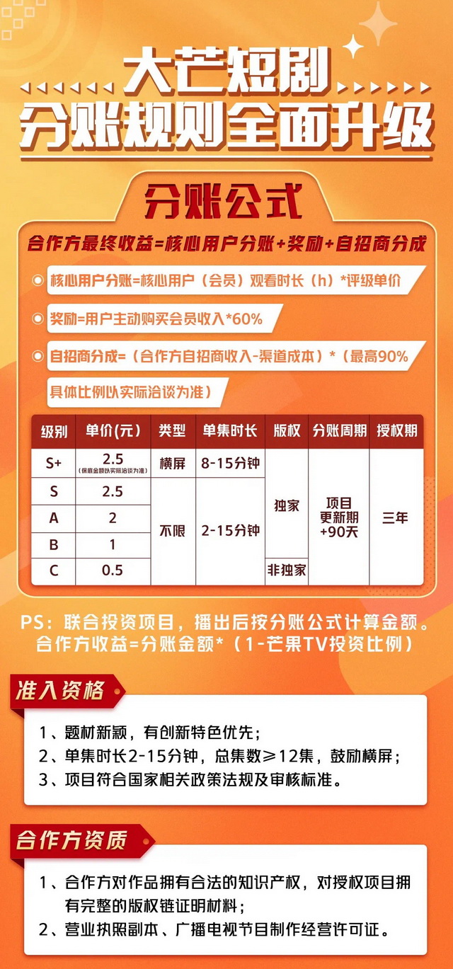 芒果TV在2019年推出“大芒计划”扶持短剧,并开设“下饭剧场”。芒果TV的分账公式是:流量分账总收益=有效UV(用户观剧总时长超过总时长的10%)*评级,1-3分钟的短剧S级0.75元、A级0.5元、B级0.3元,10-15分钟的短剧S级1元、A级0.75元、B级0.5元。