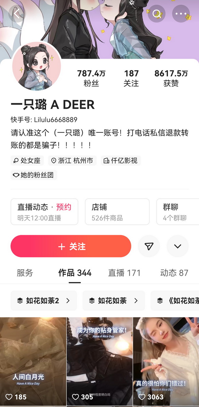 除了广告植入,短剧也在尝试达人带货变现路径,快手短剧演员一只璐 A DEER先后主演了《这个男主有点冷》和《万渣朝凰》两部爆款短剧后,共积累了787.4万粉丝,还获得了快手金剧奖最佳短剧女主角。随后,一只璐走上了直播带货之路,凭借之前积累的大量粉丝,她在春节档带货的GMV单场最高将近300万,在《如花如荼》带货直播专场销售额达1080万,目前一只璐在快手的带货总销量达到了307.4万件。