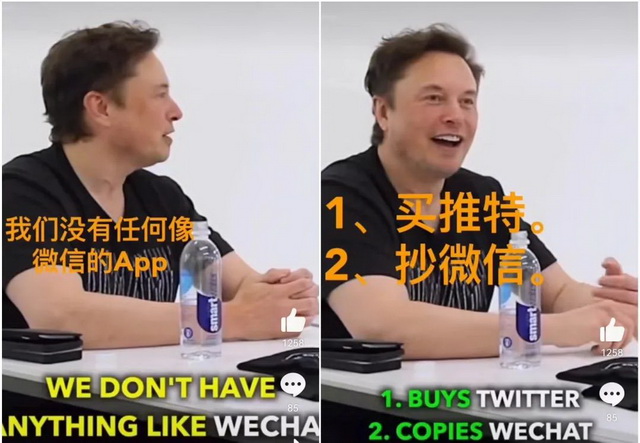 一段在国内网友之间广为流传的视频里,马斯克毫不掩饰地表达着自己对于微信的赞许之情,“它很好,微信很棒。而在中国以外,还没有像微信这样的东西。我说,让我们来抄微信怎么样?买Twitter,抄微信。”