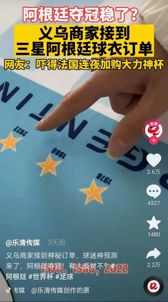 早在决赛开打之前,网上一个关于“义乌商家接到阿根廷客户三颗星球衣订单”的视频瞬间刷爆网络上了热搜。而这一次,义乌又猜对了世界杯冠军。全世界的球迷也再一次感受到了来自古老东方的“神秘”力量。