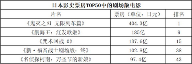 剧场版电影的本质,是基于动漫IP本身的热度或情怀来实现票房号召力,从常规意义上来说,它是一种下限较高,上限较低的产品。在日本影史票房前十中,有七部为动画电影,但只有两部是剧场版电影。把范畴拉到前五十,也只有五部。