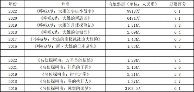 对于重复性地观赏“行活”,不论是路人观众还是粉丝都势必会感到一定程度的审美疲劳,这一点在中国市场尤为明显。《哆啦A梦》剧场版自2016年到现在,除世界观与画风有较大差异的《伴我同行》系列之外,每年在内地的票房大多数都在1亿-2亿之间徘徊,而《名侦探柯南》则是大多数在1亿-2.5亿之间徘徊。