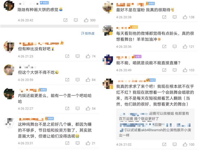 4月,总导演、制作人羊羊(@羊羊羊啊羊羊)更新微博,向网友提问“是否期待艺人凭借自己实力获得一个真正的舞台?”
