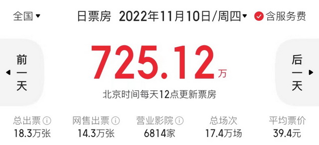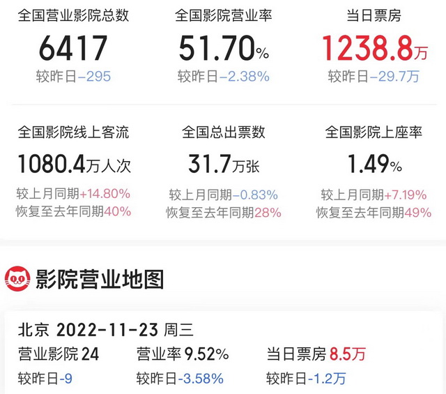 事实上,整个北方地区影院都处于停滞状态,新疆、青海电影票房为0,宁夏11月23日票房为829元。