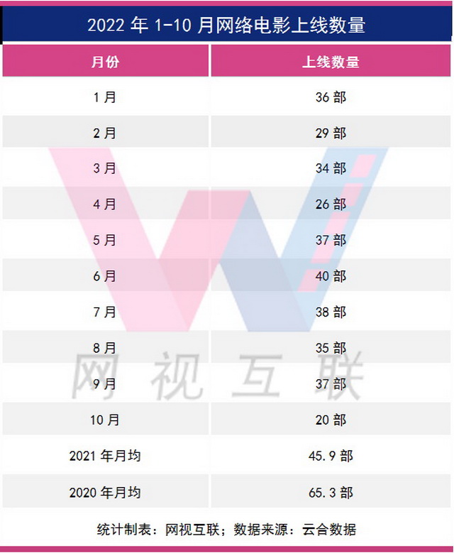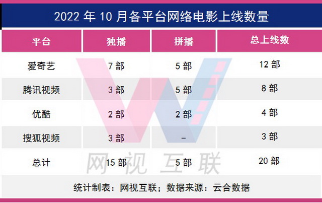 据云合数据提供给网视互联的独家信息显示,2022年10月各视频平台上线网络电影共计20部,创历年新低。