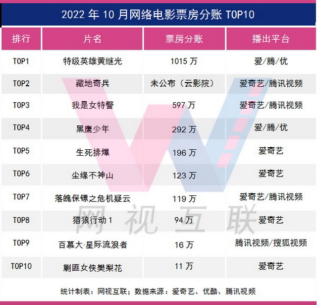 10月份票房破千万的网络电影仅1部,为《特级英雄黄继光》,票房分账1015万。