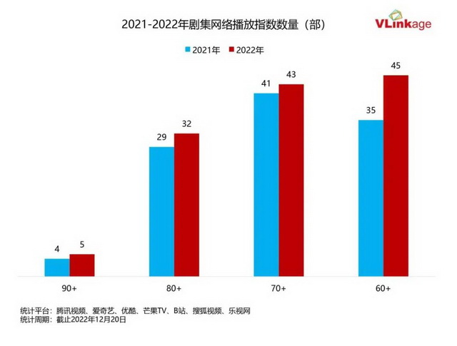 根据VLinkage数据,与2021年相比,虽然2022年热度区间的提高是全方位的,但“高热度剧集”数量的增长明显。其中60+量级的剧集,数量增长最多,涨幅达到29%,而全网关注的90+量级爆款也比前一年增加了一步,观众的选择也在显著变多。