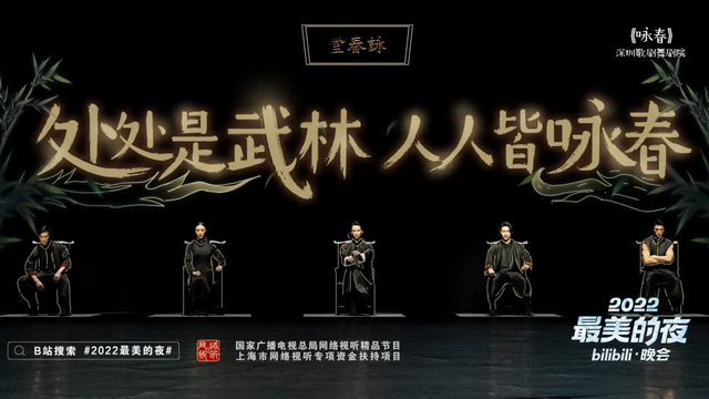 而B站也恰恰准备了具有浓郁中国风特色的跨晚节目。B站的“老朋友”周深,今年唱的是“四大名著”的影视主题曲集合。传统的“音乐整活”栏目,今年轮到“唢呐遇上爵士”,完成古典与西洋乐的碰撞。去年舞剧《只此青绿》亮相B站“最美的夜”,成为当年的跨晚爆款。今年《只此青绿》的原班人马打造了舞剧《咏春》,不少观众在弹幕留言“想买票”“想看现场”。