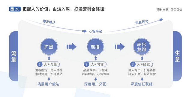在“人+流量”方面,企业主可以达人为轴扩圈投流,复用素材加速用户触达,实现视频播放量、完播率和互动量显著增长;在“人+内容”方面,企业主可借力达人故事和IP内容,树立品牌形象,深化用户心智种草,实现深度互动;在“人+经营”方面,打破“人”作为终端消费者的定位,由人背书引导转化与复购,借势经营策略达成长效生意。