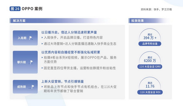 举例而言,OPPO作为领先3C品牌2021年上半年开始在快手运营。在入局期,OPPO一方面开启品牌日播打造特色内容,另一方面通过大场营销+达人分销直播迅速融入快手生态;在攀升期,OPPO一方面拍摄系列短视频加强内容建设,另一方面直签四位带货主播并运营粉丝群提升粉丝粘性;在成熟期,OPPO将新品上市节点和快手节点有机结合,在116大促期和年货节都做了联合营销。