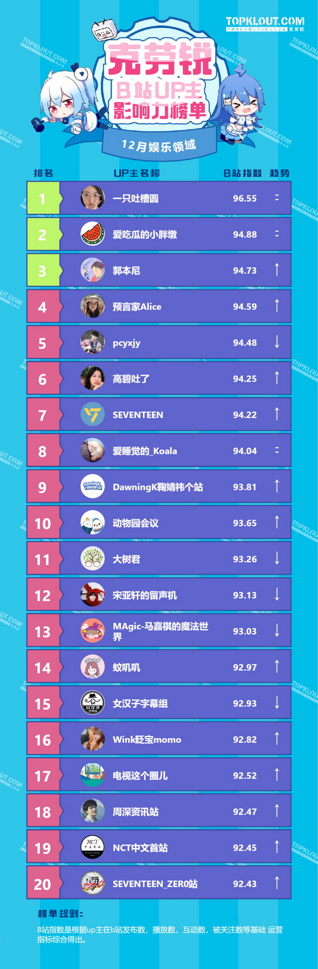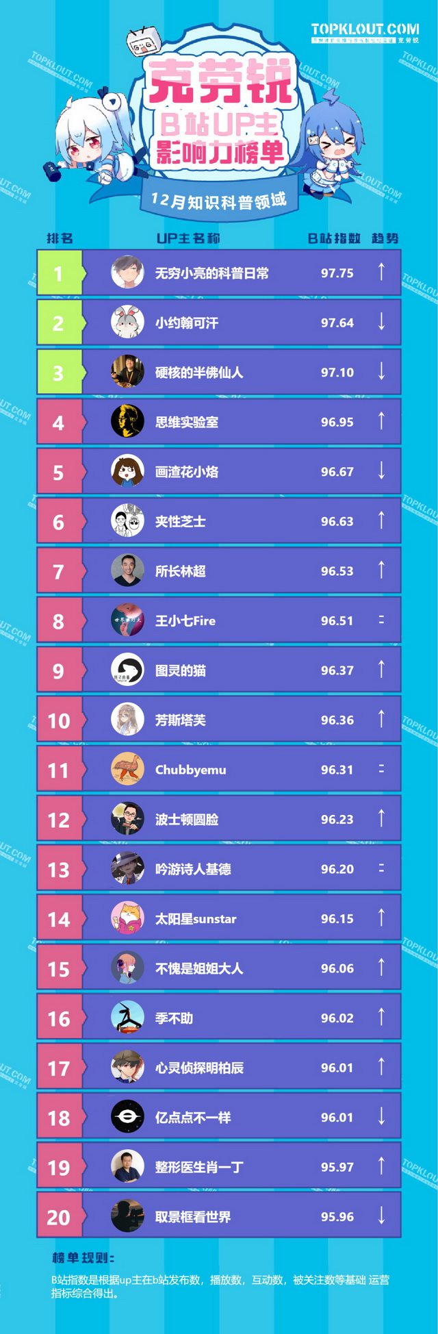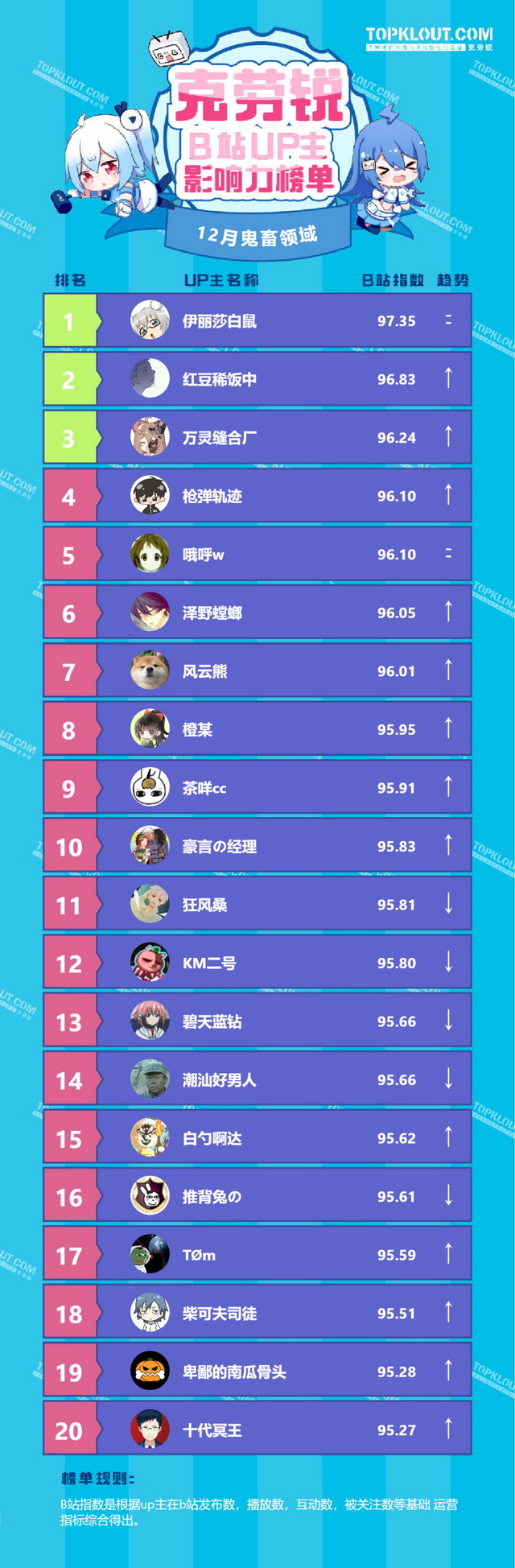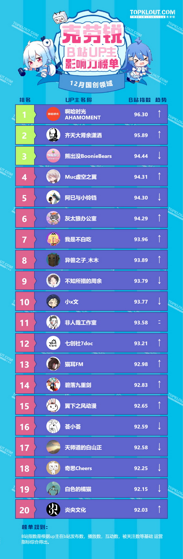 各垂类头部UP主排名依据的是“B站指数”。B站指数是根据每位UP主的内容发布量、播放量、转发量、评论量、收藏量、点赞量、关注量共七个维度综合计算得出的,是客观反映UP主的影响力及营销价值的重要指标。我们来一起看看12月榜单吧!