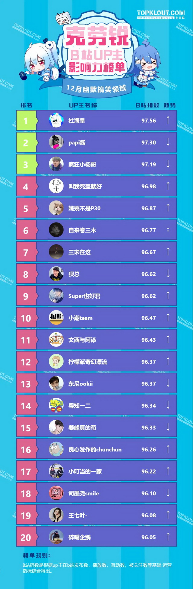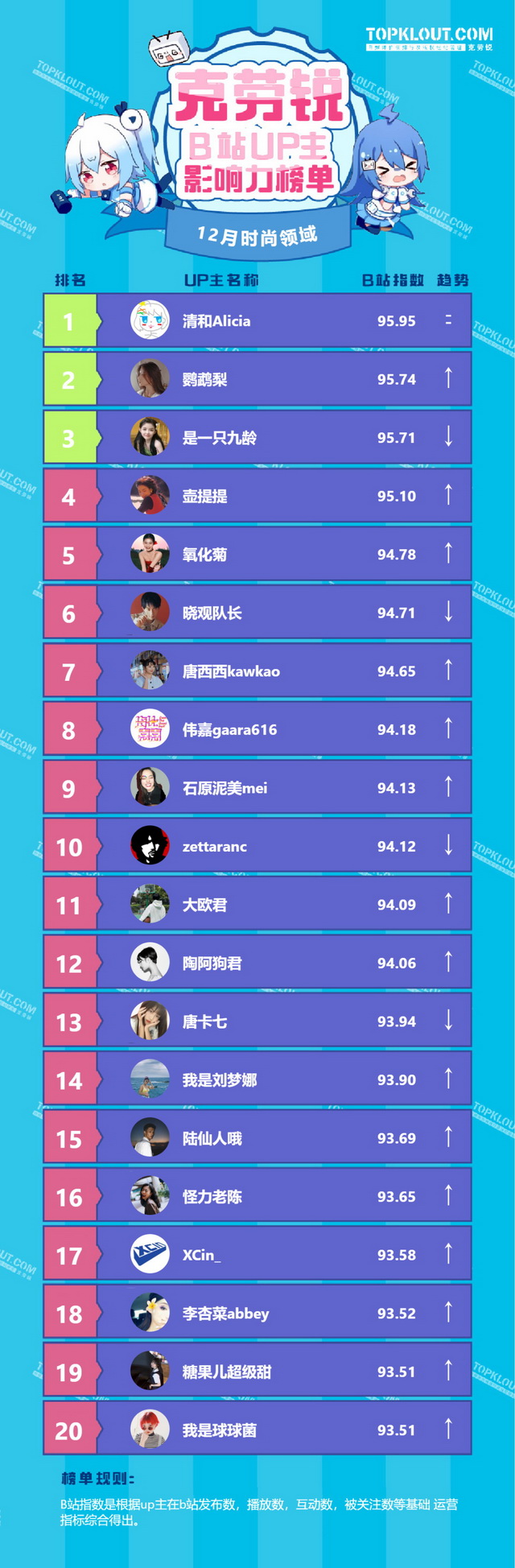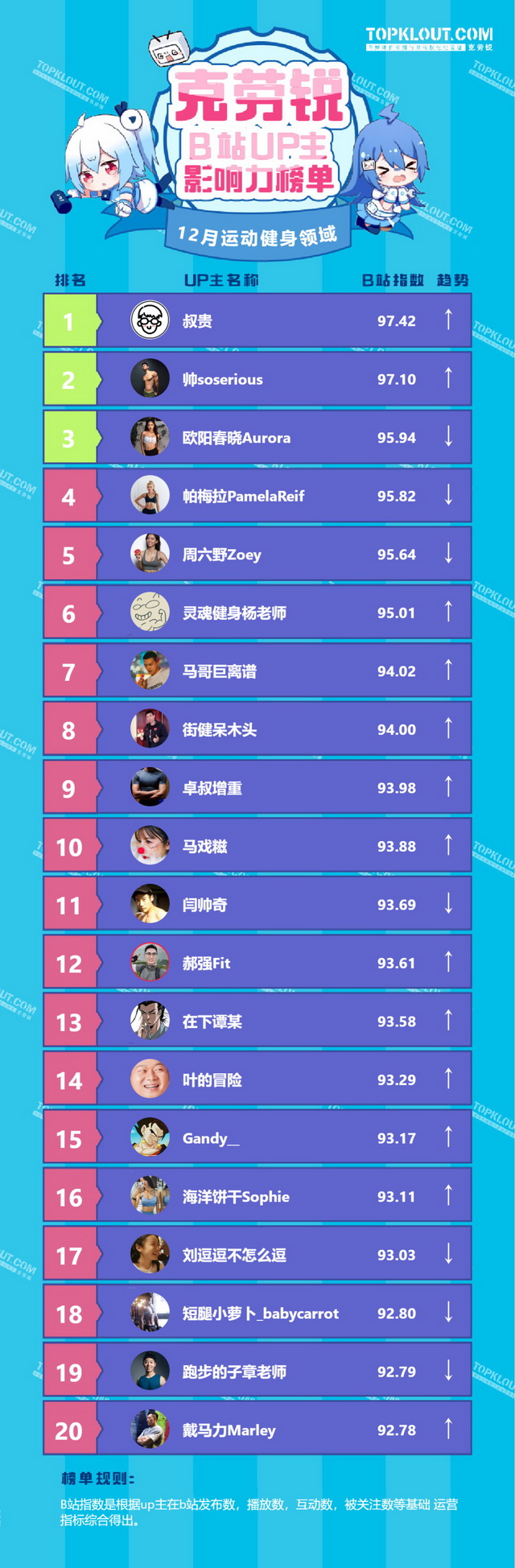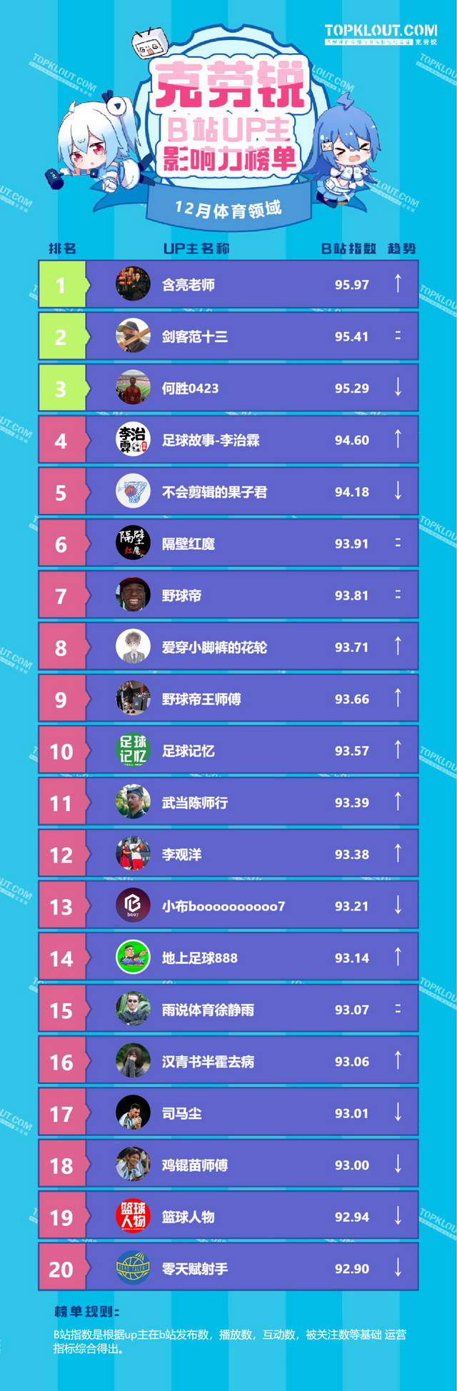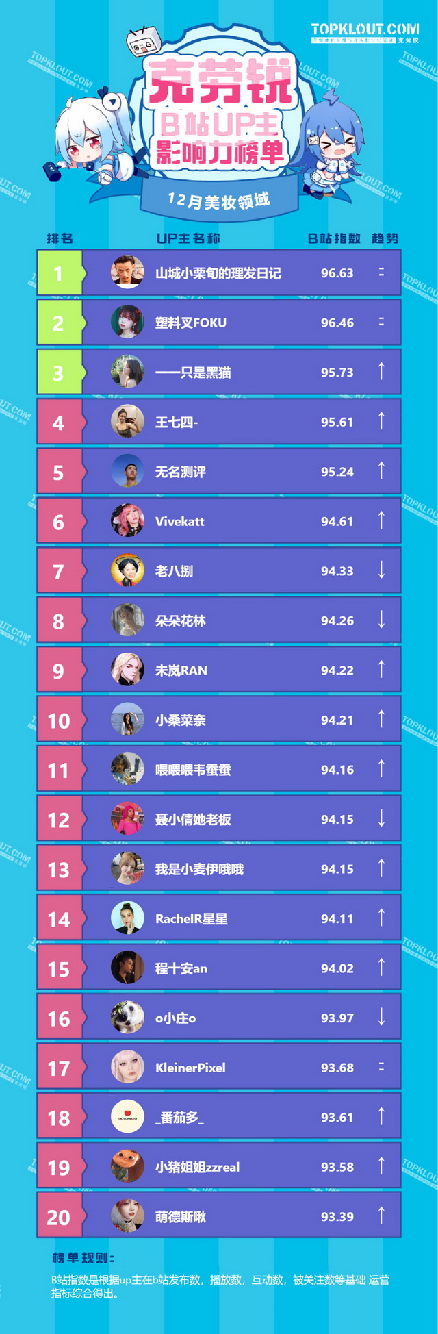 各垂类头部UP主排名依据的是“B站指数”。B站指数是根据每位UP主的内容发布量、播放量、转发量、评论量、收藏量、点赞量、关注量共七个维度综合计算得出的,是客观反映UP主的影响力及营销价值的重要指标。我们来一起看看12月榜单吧!