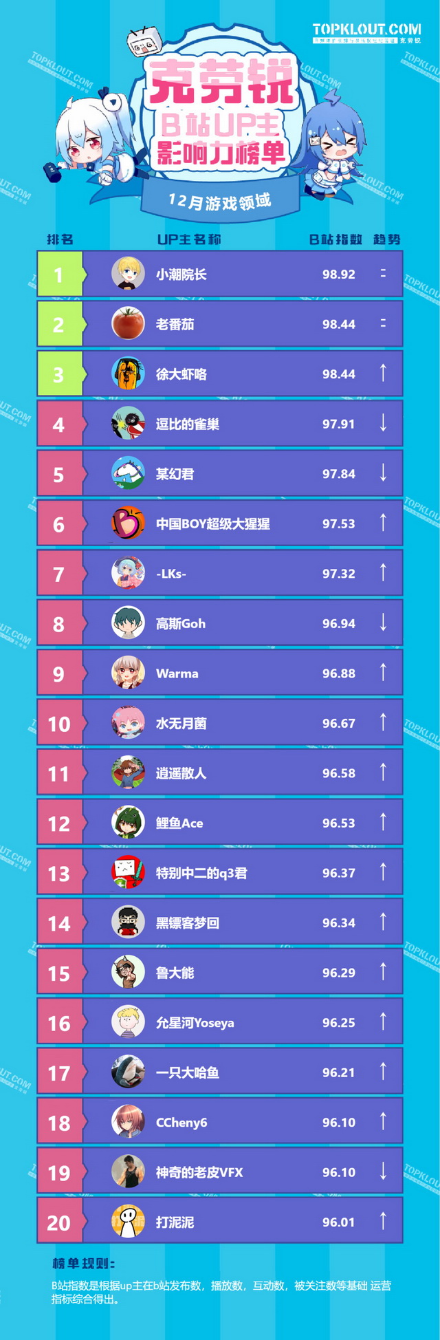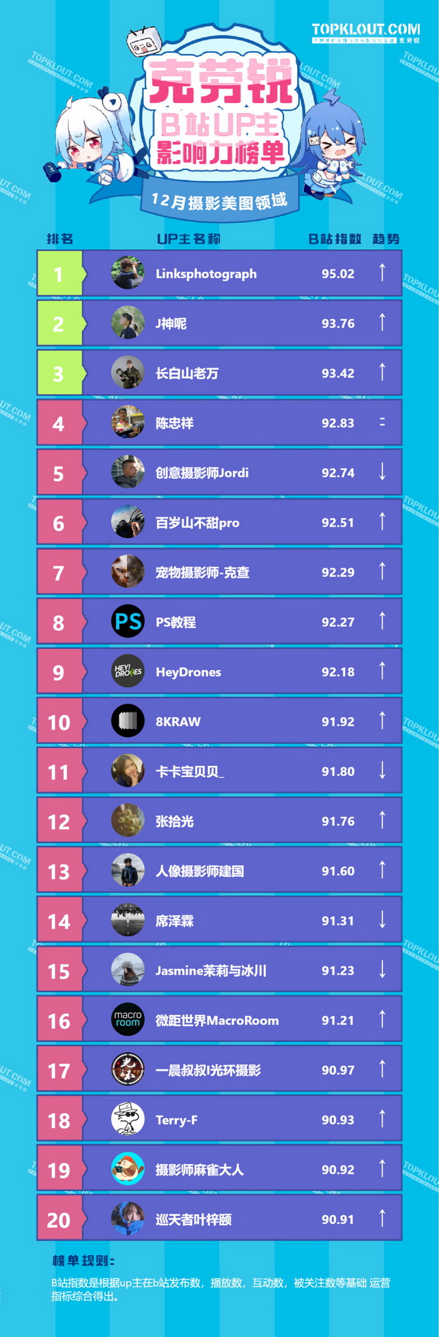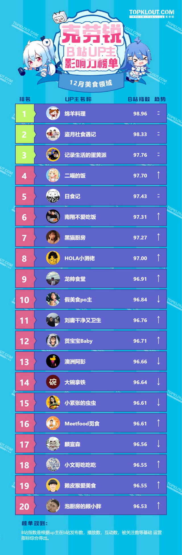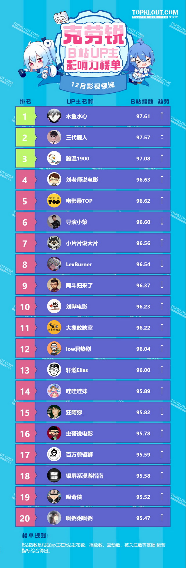 各垂类头部UP主排名依据的是“B站指数”。B站指数是根据每位UP主的内容发布量、播放量、转发量、评论量、收藏量、点赞量、关注量共七个维度综合计算得出的,是客观反映UP主的影响力及营销价值的重要指标。我们来一起看看12月榜单吧!