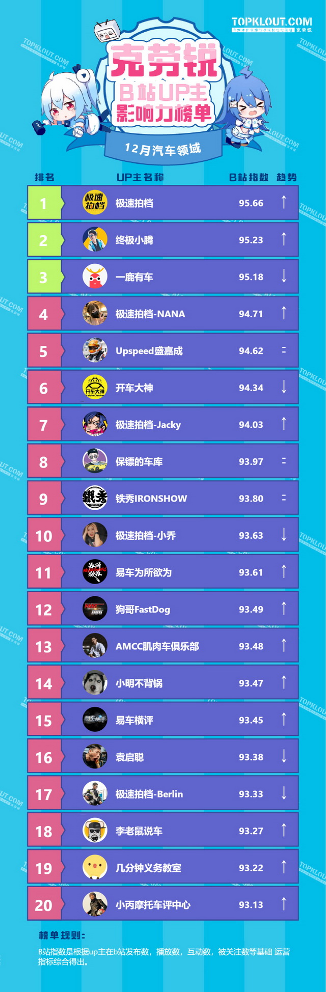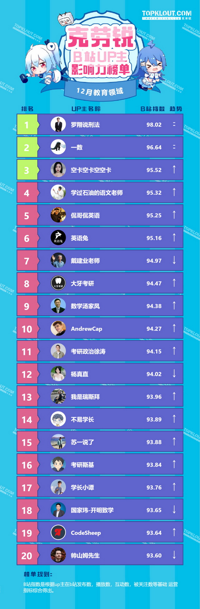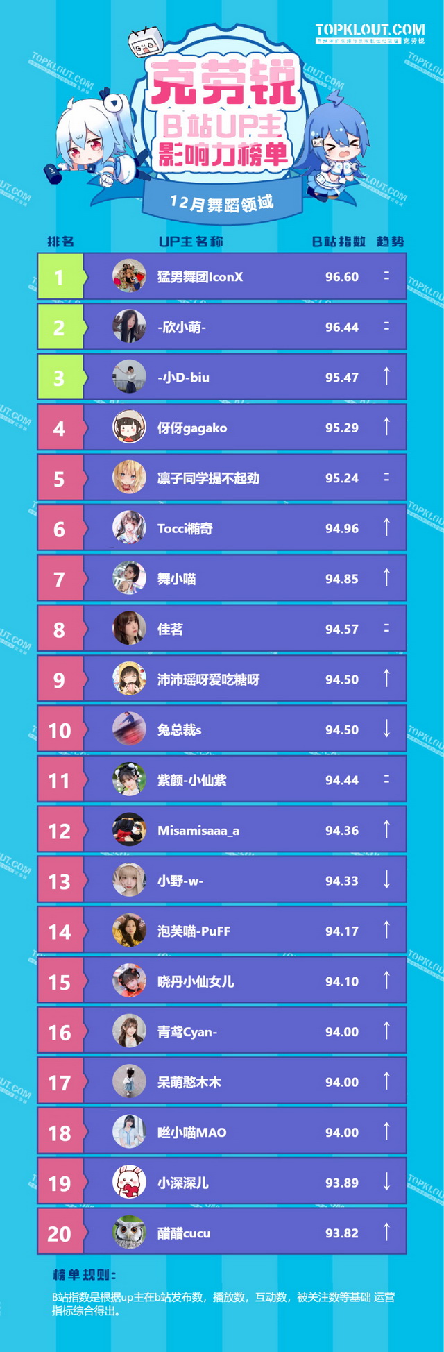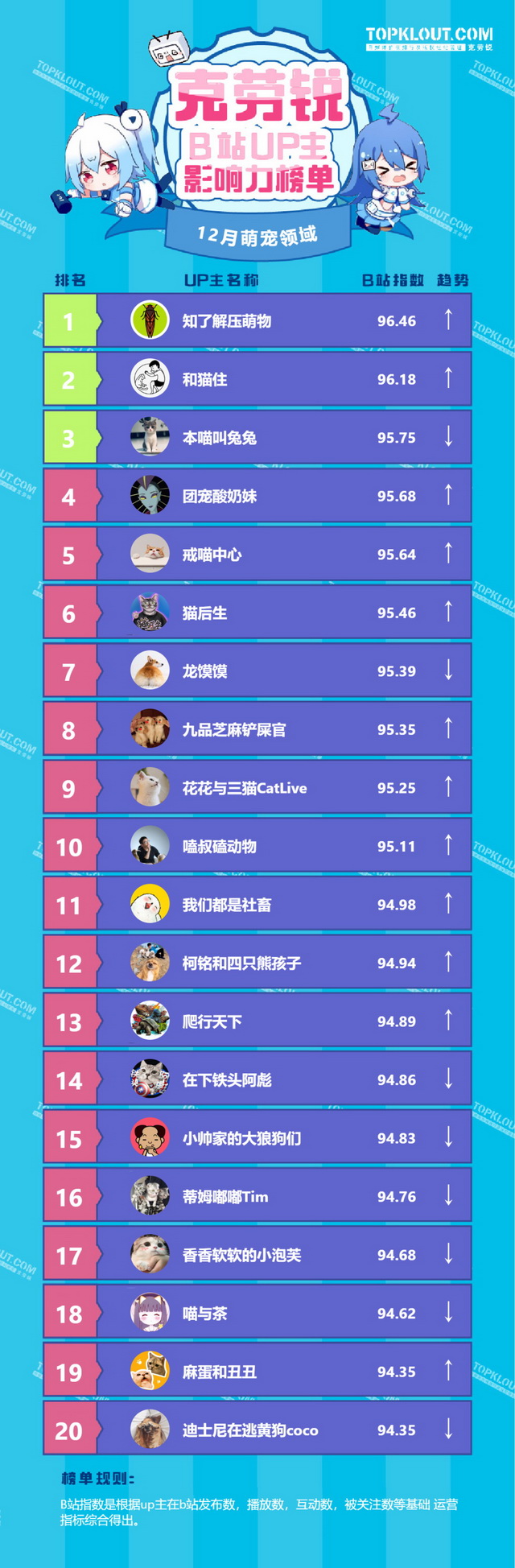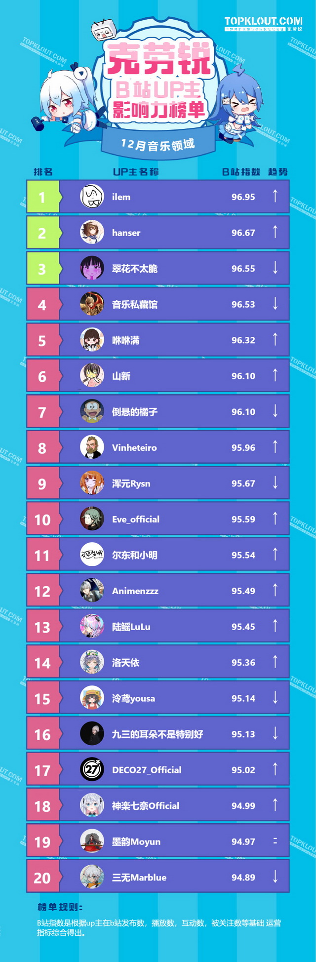各垂类头部UP主排名依据的是“B站指数”。B站指数是根据每位UP主的内容发布量、播放量、转发量、评论量、收藏量、点赞量、关注量共七个维度综合计算得出的,是客观反映UP主的影响力及营销价值的重要指标。我们来一起看看12月榜单吧!