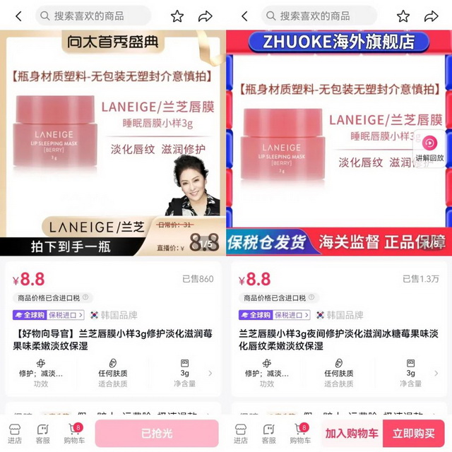 不过,「电商在线」通过观察发现,不少号称福利款的商品其实并没有优惠:向太表示“我等会也要买几个”的兰芝唇膜,在直播间售价8.8元,虽然链接已经售罄,但在同一家店铺中可以发现还有同款商品在售,日常价同样是8.8元。