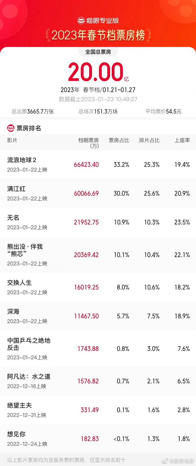 IT之家 1 月 23 日消息,据猫眼专业版实时数据,截至 1 月 23 日 10 时 49 分,2023 年春节档电影总票房(含预售)突破 20 亿元。