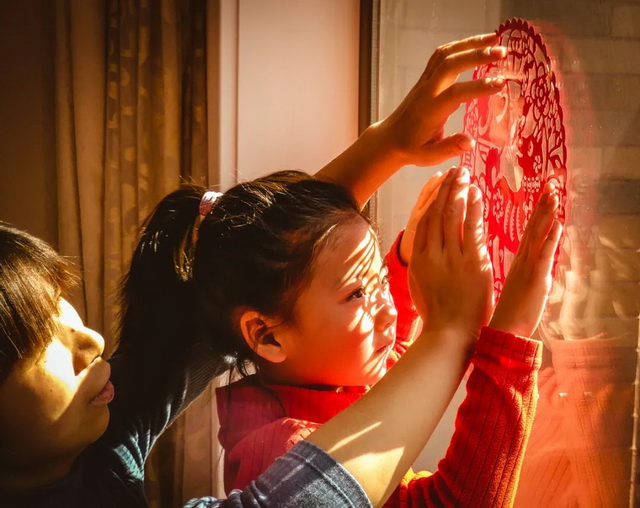 ▲妈妈和女儿大年二十六擦完玻璃贴窗花,阳光撒在两个人的脸上 ,映衬着的那种专注的仪式感和母女情深的温馨。
