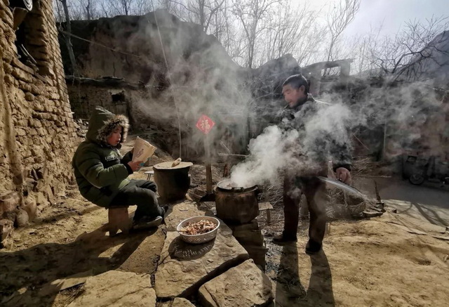 ▲ 2019年2月3日,太行山脚下的山村农家院,孩子读书,父亲做饭,用柴火铁锅炖肉,满院肉味飘香,丰富了年夜饭使年味浓浓。