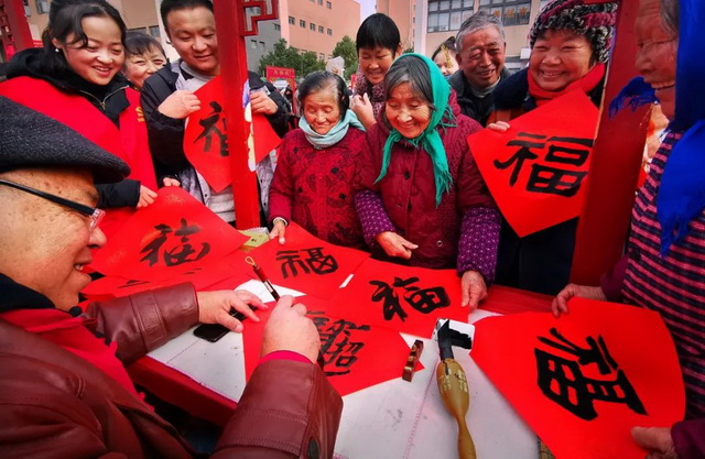 ▲ 元月18日中午,上海浦东新场古镇居委召集辖区内有才艺居民双休日免费给居民写年福,这样的“送文化”举动,得到老百姓的点赞。