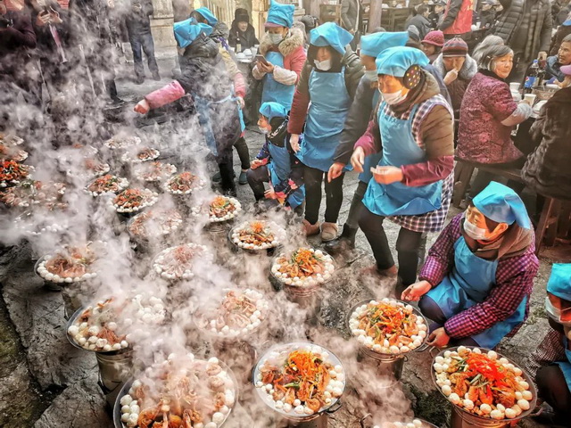 ▲ 每年元旦,安徽歙县三阳都要为村里近200名七十岁以上老人举办一场亲老宴,这是徽州传统名菜罗汉锅捧上酒桌的情景抓拍。