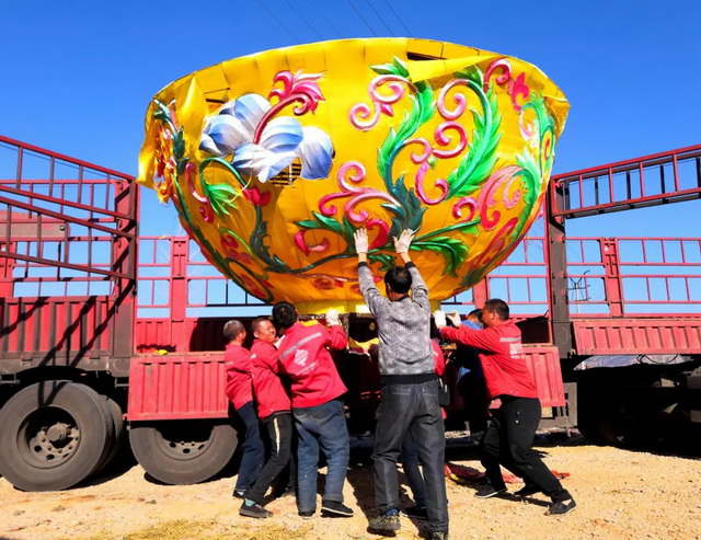 ▲ 2020新春佳节到来了,随着最后一件展品一一巨大的“金饭碗”运抵布展现场,云南省罗平县春节盛宴一一大型彩灯展随即拉开序幕。