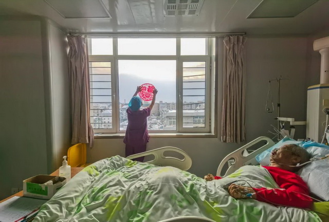 ▲ 2022年1月31日,在河北省秦皇岛市山海关区秦皇岛市工人医院,医护人员正在icu病房贴窗花。