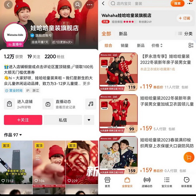 左:娃哈哈童装抖音新账号 右:娃哈哈童装新的天猫旗舰店