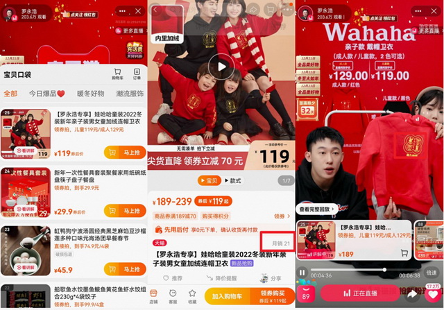 “此娃哈哈,就是那个娃哈哈呀!”12月20日,罗永浩淘宝直播间,一款娃哈哈的亲子款戴帽卫衣,勾起了一波回忆杀。女主播现场唱起娃哈哈耳熟能详的广告歌,男主播紧跟着接梗:“这个我肯定听过呀,我毕竟是有童年的。”这款率先登上头部主播直播间的卫衣,印着娃哈哈标志性的AD钙奶图案和“前兔似锦”祝福语,儿童款标价119元,成人款129元。