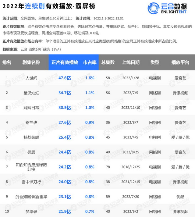 此情此景,难免让人回想起去年几部开年剧的“盛景”,《人世间》和《开端》在某种程度上成为去年全年的标杆作品,前者几乎是整年唯一称得上“穿透圈层”的大剧,根据云合数据发布的有效播放榜单,《人世间》以47.6亿断层领跑;后者则是近几年较为少见的题材创新之作。
