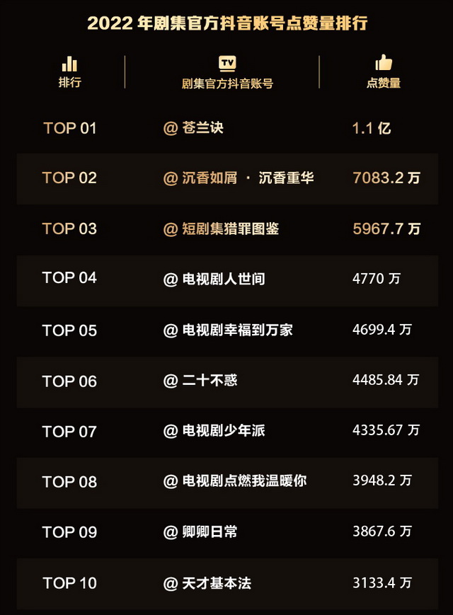 以微博和抖音两个目前用户基础最大的平台为例,二者挑选出的“年度爆款”略有不同。在抖音,去年官方账号点赞量排在前三位的是《苍兰诀》《沉香如屑》和《猎罪图鉴》,《幸福到万家》也有热门话题上榜;《星汉灿烂》《余生请多指教》《冰雨火》等在微博热度较高的剧,则都未能进入抖音账号点赞榜TOP10。