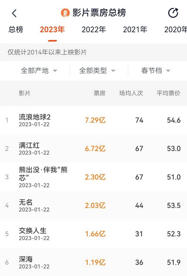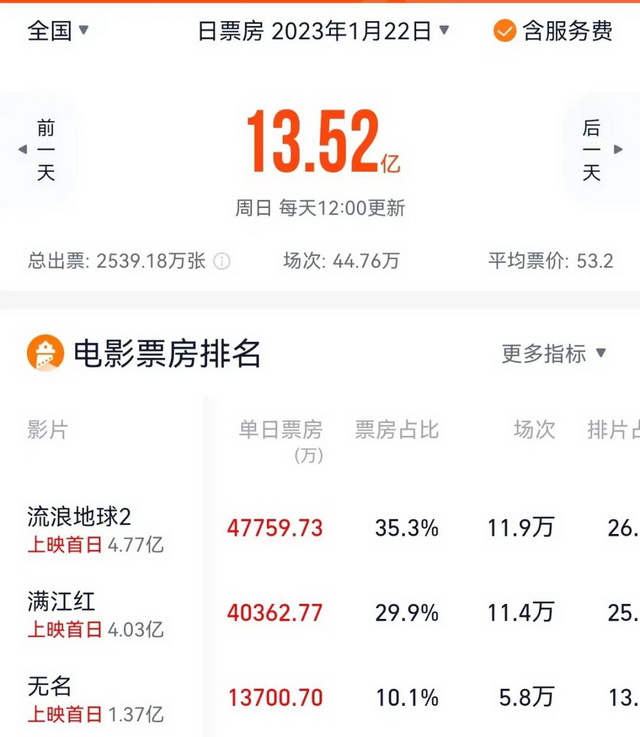 具体来看,《满江红》首日票房第二,与单日冠军《流浪地球2》有7400万票房的差距,但其上座率更高,领先了7个百分点。在初二和初三目前的排片中,《满江红》均实现了对《流浪地球2》的反超,至毒眸发稿前,大年初二的票房冠军位置仍由《满江红》占据。《流浪地球2》的片长太长,对排片影响较大,如果未来几日上座率不能有效提升,将严重威胁后续排片,从而决定档期冠军的归属。