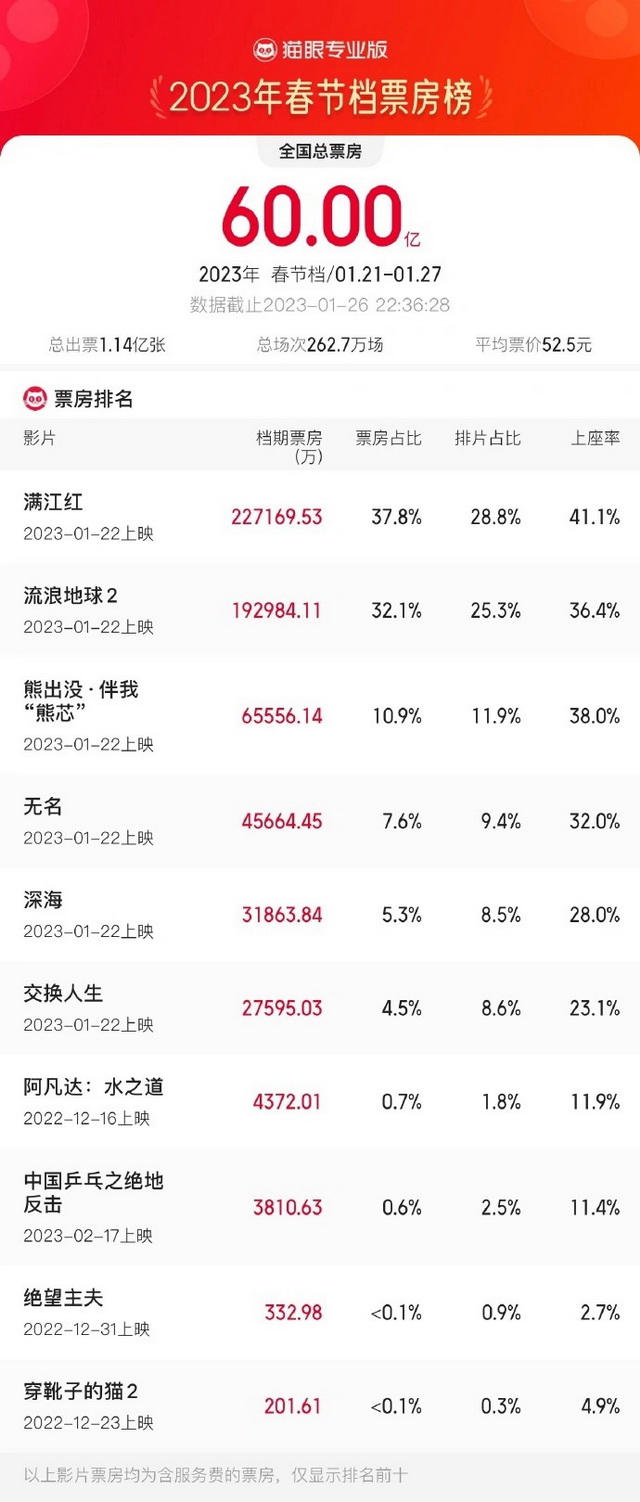 根据猫眼专业版数据,2023 年 1 月 26 日 22 时 36 分,2023 年春节档(1 月 21 日-1 月 27 日)总票房(含预售)破 60 亿!《满江红》《流浪地球 2》《熊出没?伴我“熊芯”》分列春节档票房前三位。