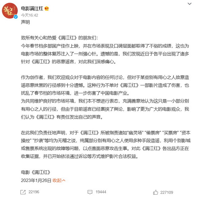 在此我们负责任地声明,对于《满江红》所被指责诸如 "幽灵场" "偷票房" "买票房" "资本操控" "抄袭" 等均为无稽之谈,纯属部分别有用心之人使用多种手段造谣,利用个别影城或售票系统出现的故障等问题,以点盖面恶意攻击生事。对此《满江红》各出品方正在收集证据,并已开始依法通过诉讼等方式维护影片合法权益。