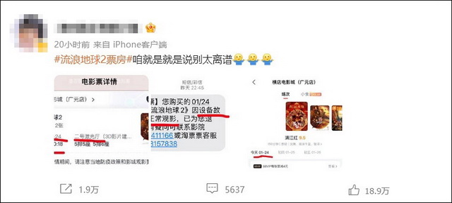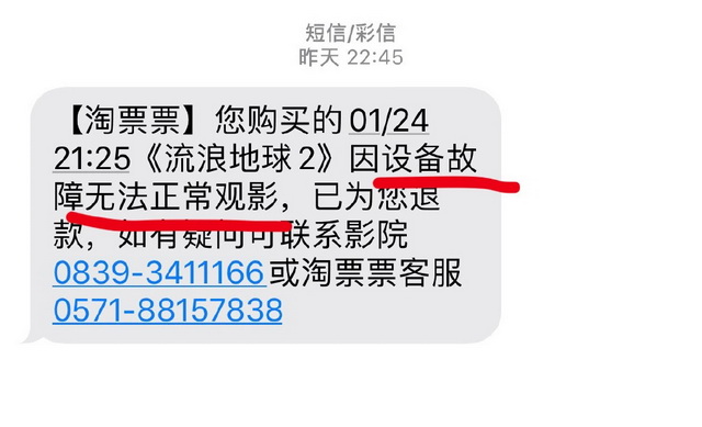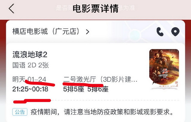 IT之家了解到,1 月 24 日晚间,有微博网友反映,自己购买的《流浪地球 2》电影票被影院以“设备故障”为理由退款后,发现影院又将当天同一时段的同一放映厅让给了同期上映的《满江红》,引发争议。