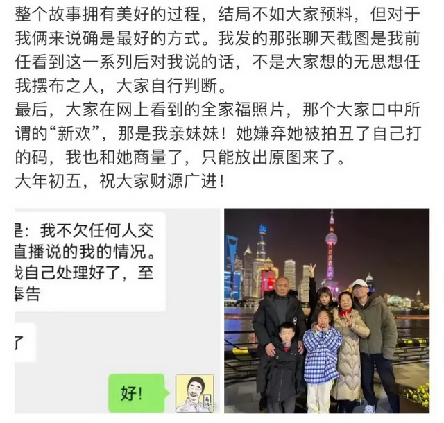 为此,杨迪在1月26日重新发布长文回应,表示不要孩子是两人共识,两人和平分手,分手之后和前任的关系也仍旧如同亲人,杨母抖音全家福被打码的女生,是杨迪的亲妹妹。