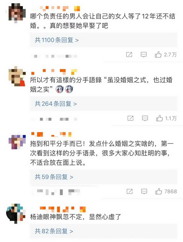 于是,讨伐大军如约而至。不少人涌入杨迪和其母亲的社交账号下留言:大多数看客的观点,都是心疼女方浪费的17年青春,以及指责杨迪没能信守承诺。有网友发现,杨迪妈妈近期在抖音发布的全家福中给一位女生打了码,舆论的风向开始又转向是不是杨迪“另结新欢”。