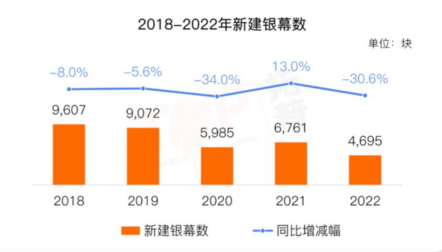 2022年的银幕增速,很显然无法支撑这个目标。拓普报告显示,2022年新建影院805家,较2021年下滑27.1%,除1月(春节期间)外,各月新建数量均远低2021年同期;全年新建银幕数量4695块,较2021年减少30.6%,数量仅为2019年疫情前的一半。