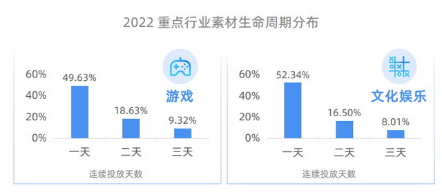 这点也有一些直观的数据体现,比如AppGrowing发布的《2022移动广告流量观察白皮书》显示,整体素材生命周期都较短,游戏行业有49.63%的素材只投放一天,18.63%的素材投放两天。现在买量素材以视频为主且对广告质量要求越来越高,厂商成本提升,同时用户却越来越不愿意点击,素材复用率低。