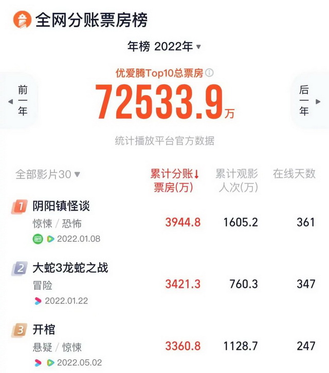 数量上几近腰斩,头部作品影响力也十分有限:去年年底行业还在讨论分账票房冠军是否再难回5000万大关,到了今年则干脆连一部破4000万的也没有。排名前三甲的分别为《阴阳镇怪谈》3944.8万、《大蛇3龙蛇之战》3421.3万和《开棺》3360.8万,它们在近三年的票房排行中仅能排到第六、第九和第十一。