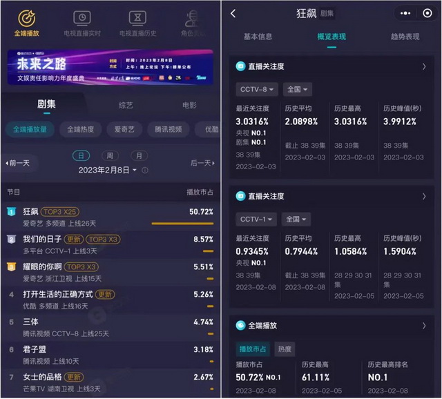 真正的爆款,?部分指标都是名列前茅的。据酷云EYE数据显示,《狂飙》的全端播放量突破50亿,也是单日全端播放量首次突破3亿。