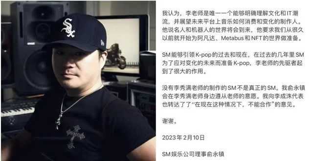 在SM从业25年以上的俞永镇在2月10日表示:“在目前情况下不可以一起合作。没有李秀满老师进行制作的SM不是真正的SM。难以同意现管理层3日发表SM 3.0时代展望中把李秀满老师的制作排除在外的部分。”