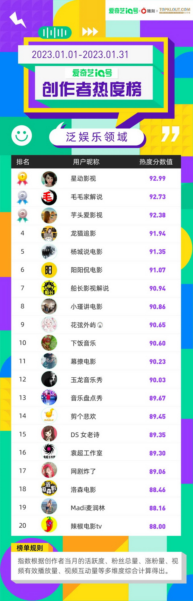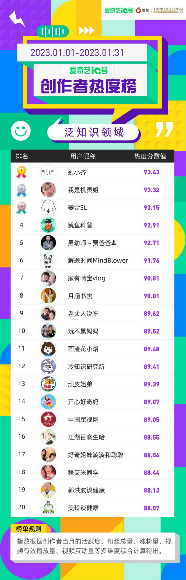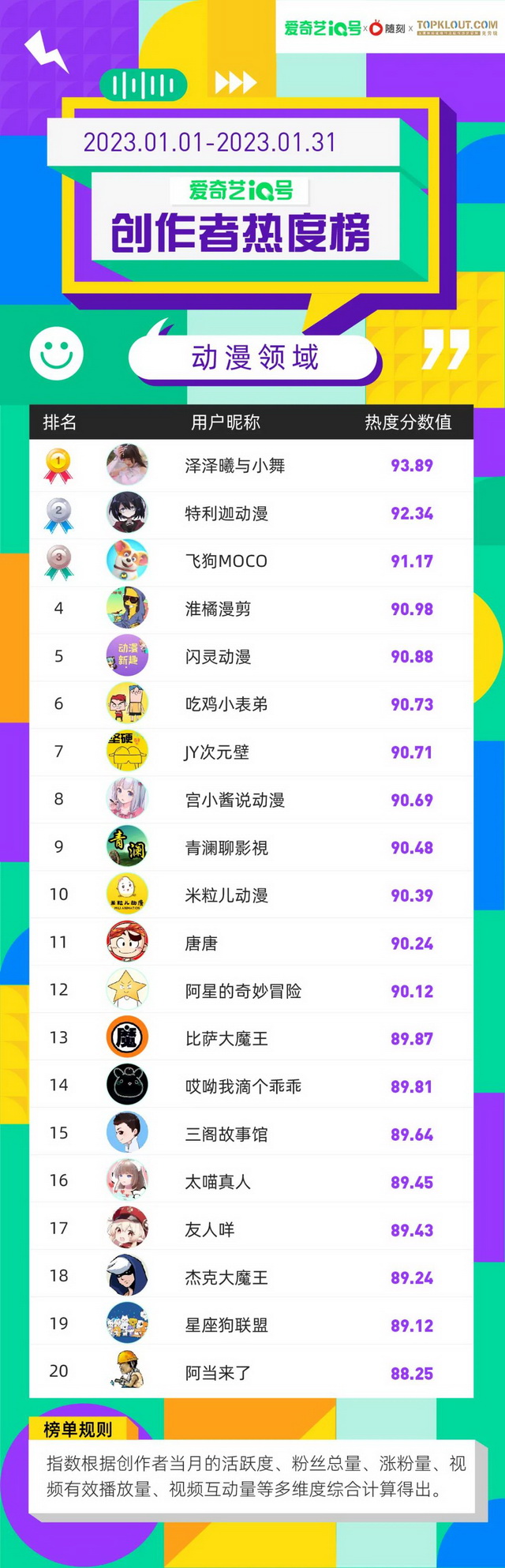 我们来看一下1月克劳锐与爱奇艺iQ号、随刻联合发布的榜单!