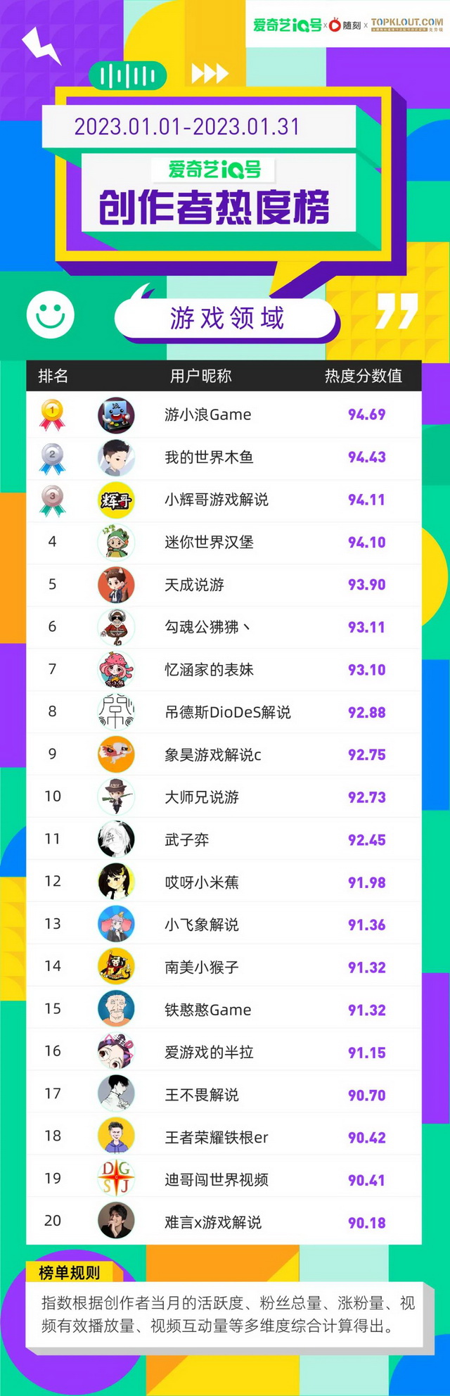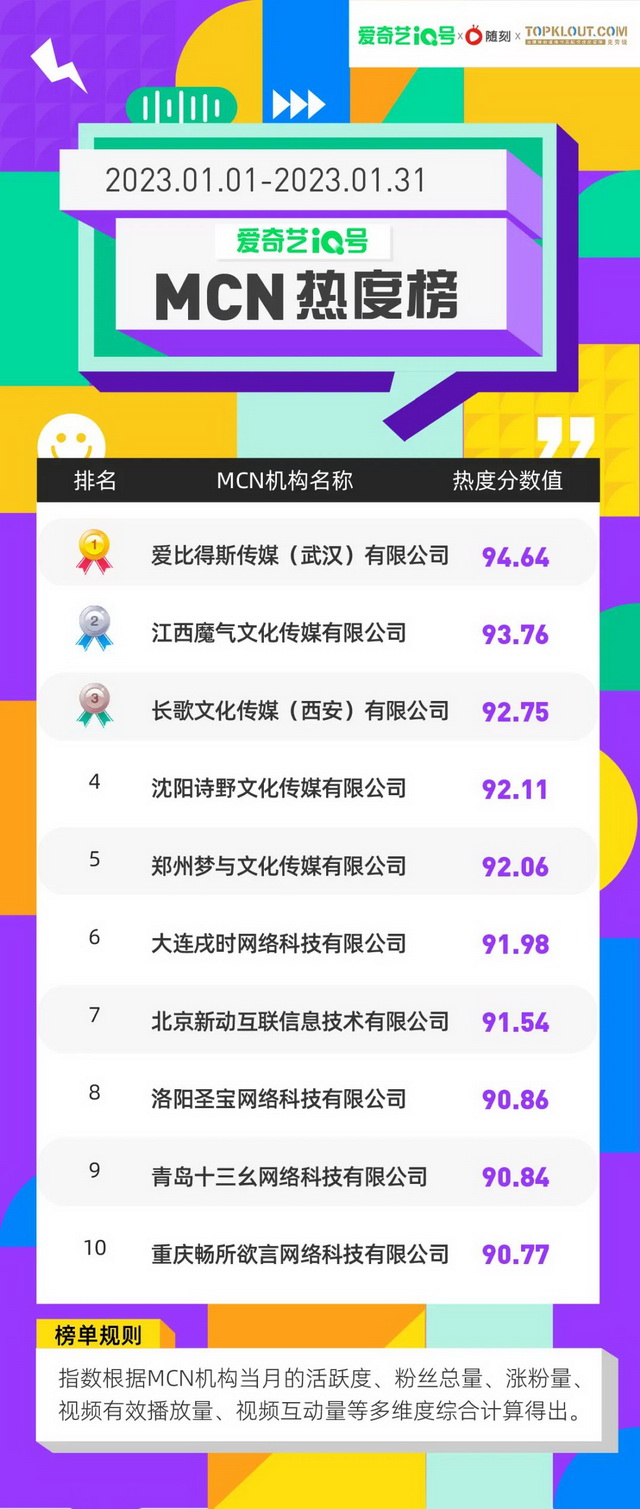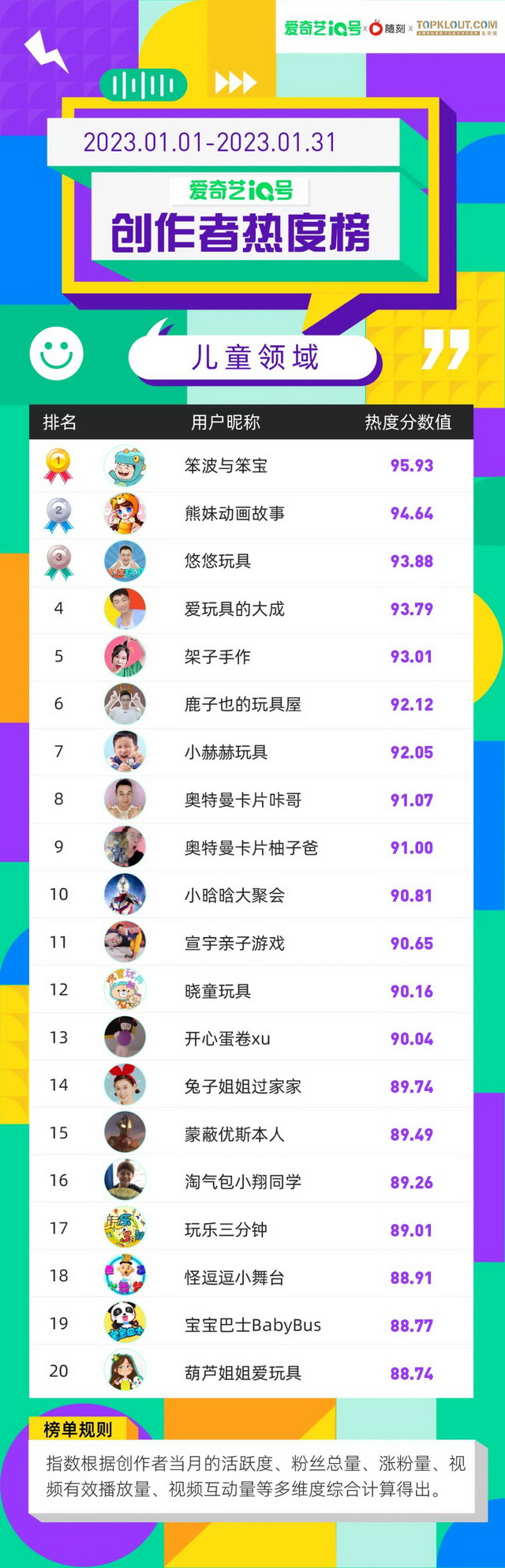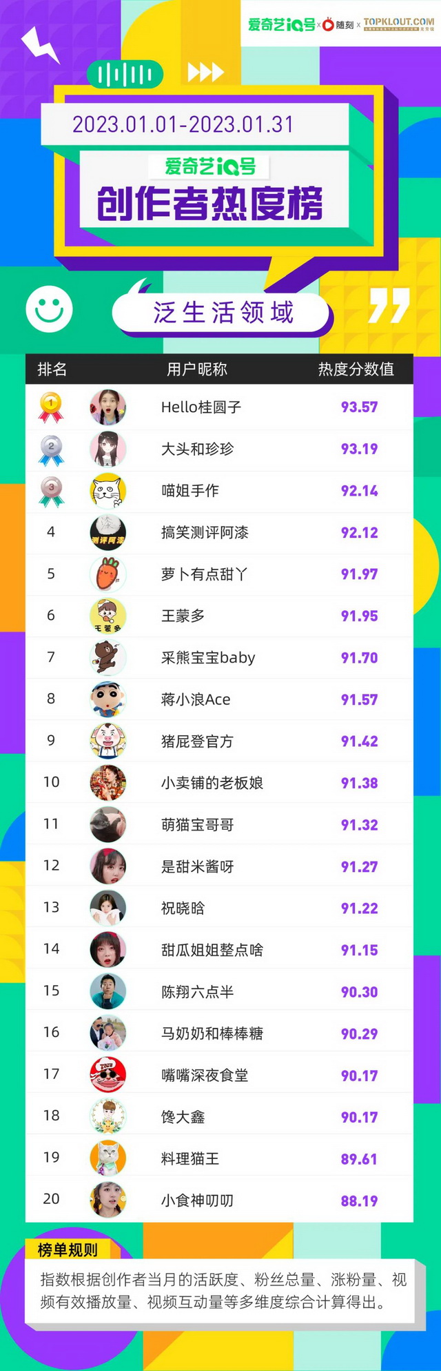 我们来看一下1月克劳锐与爱奇艺iQ号、随刻联合发布的榜单!