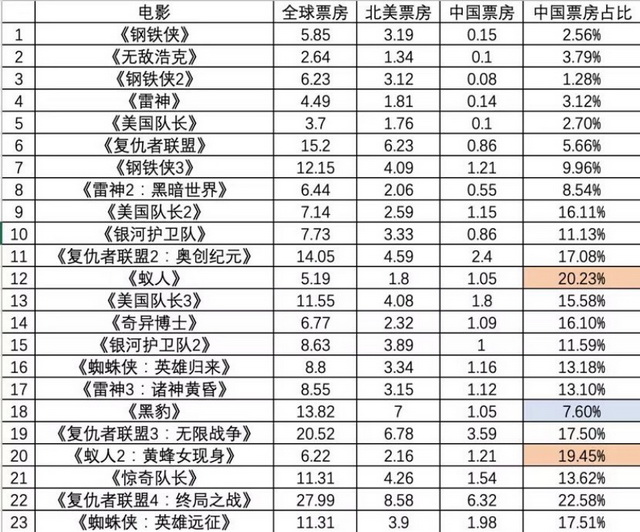 《蚁人》与《蚁人2》的中国票房占比均达到了接近20%,除《复仇者联盟》系列之外,是单人英雄电影中最高的两部,而最低的,自漫威第一阶段之后,就非《黑豹》莫属。