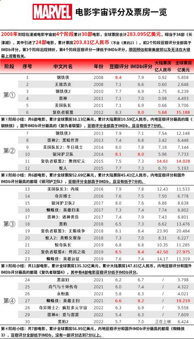 即便是这群尚有兴致观影评分的核心粉丝,对第四阶段的影片质量也颇有微词。据后浪电影统计,漫威第一、二阶段影片的豆瓣评分全部高于IMDB,且没有一部低于7分;而到了第四阶段,局势则完全逆转,豆瓣评分全部低于IMDB,且没有一部在7分以上。